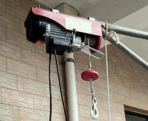 和室外吊運機搭配使用時,微型電動葫蘆的安裝方式是倒裝,因為吊運機的機座支架位于吊運機中間位置,只有安裝在機座上,微型葫蘆的鋼絲繩才能順著吊臂向下延伸,方便吊運重物,在微型葫蘆的罩殼頂部有安裝孔,直接用螺絲就能固定在吊運機機座上。