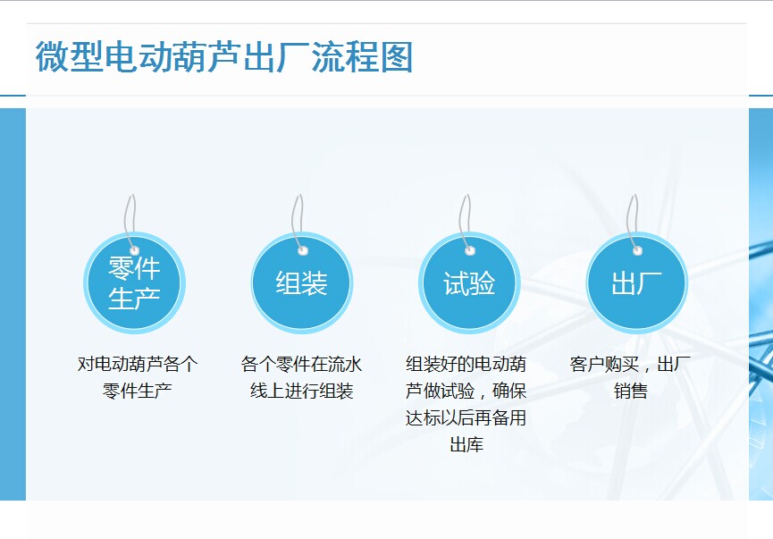 解密電動葫蘆的出廠流程 時間 :2014-09-27 來源 :杭州冠航微型電動葫蘆制造廠